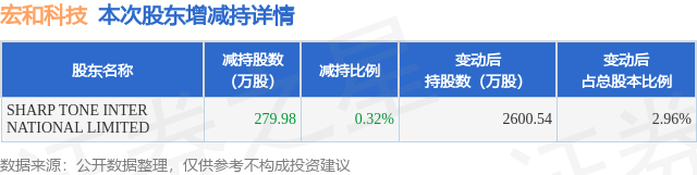 证券之星消息,11月5日宏和科技发布公告《宏和科技:宏和科技股东减持股份结果公告》,其股东SHARP TONE INTERNATIONAL LIMITED于2025年9月11日至2025年11月5日间合计减持279.98万股,占公司目前总股本的0.3183%,变动期间该股股价下跌9.74%,截止11月5日收盘报32.34元。