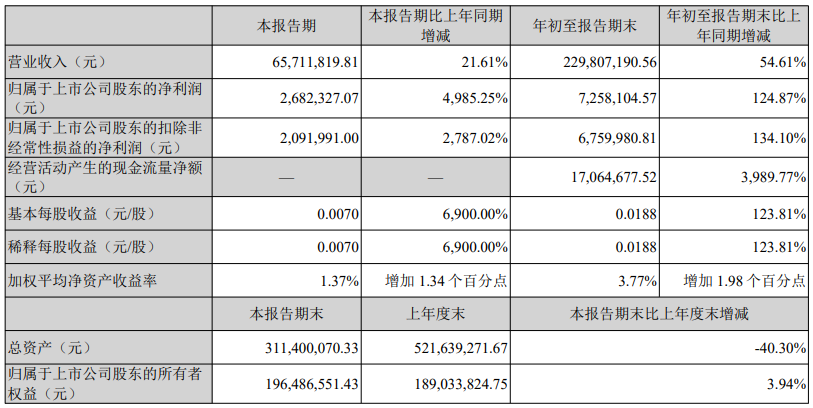 【大河财立方消息】10月20日,合金投资(000633)发布2025年第三季度报告。其中,第三季度营收为6571.18万元,同比增长21.61%;归属于上市公司股东的净利润为268.23万元,同比增长4985.25%。